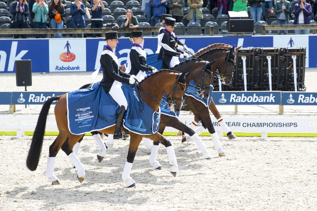 Het waren niet de Duitsers die vanmiddag in Rotterdam voor een verrassing zorgden, maar de Nederlanders. Onduidelijkheid alom, maar het Nederlandse team, bestaande uit Edward Gal, Hans Peter Minderhoud, Anne Meulendijks en Emmelie Scholtens, wist na uitsluiting van Dujardin onder luid gejuich van het publiek de zilveren medaille te pakken. Brons ging naar Zweden.