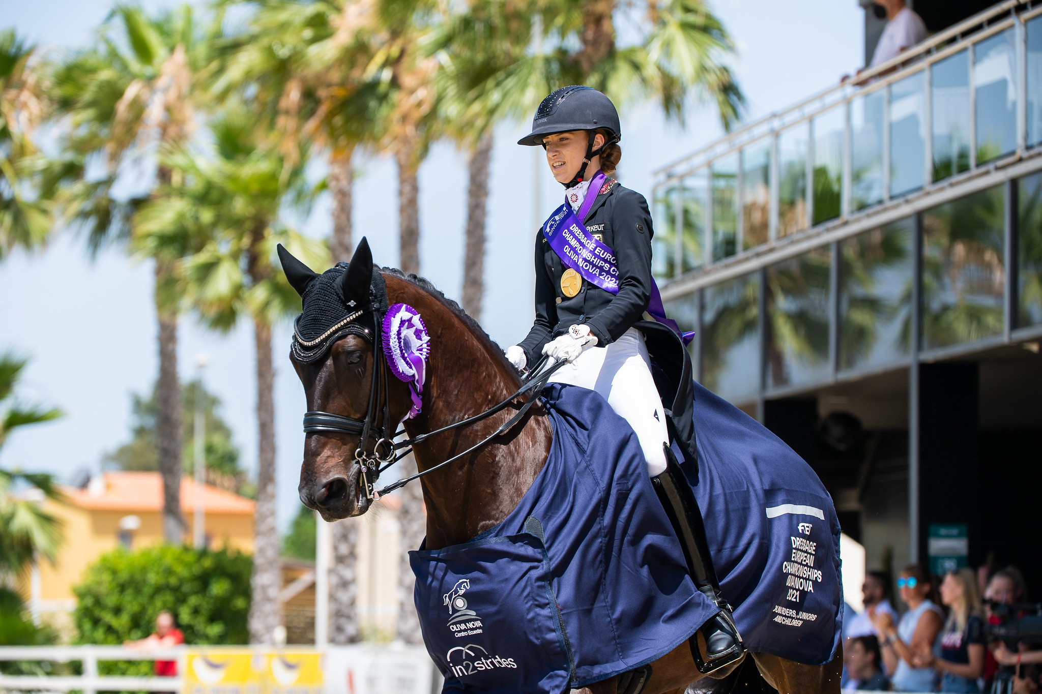 Today was the final day for the FEI European Championships Children, Juniors and Young Riders in Oliva Nova. The judges were impressed by the test from the German rider Lucie-Anouk Baumgürtel and Zins Hugo FH (v. Spielberg) and placed her all at the first place and had a beautiful score from 82,045%. Second place was for the British rider Annabella Pidgley and Sultan des Paluds FRH (v. Soliman de Hus). Annabella and Sultan des Paluds are a brand new combination, but preformed incredibly well this championships and take home their first silver medal. Bronze went to the rider from Austria Paul Jöbstl and the beautiful Hannoverian stallion Bodyguard 49 (v. Burlington).